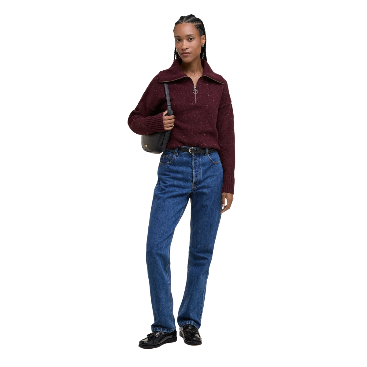 The Barbour Lavensdale Half-Zip Jumper in Black Cherry is a must-have for the modern woman’s winter wardrobe. The rich burgundy shade radiates warmth and elegance, while the soft wool blend and relaxed fit offer ultimate comfort. Pair this half-zip jumper effortlessly with jeans for a casual look or tailored trousers for a smarter style. The deep color works beautifully with neutrals like black, grey, and cream, as well as classic Barbour green. Layer it under a Barbour wax jacket or a quilted jacket for the perfect outfit. With the Lavensdale Jumper, you add timeless charm and versatility to your wardrobe – an investment in both style and comfort, season after season.