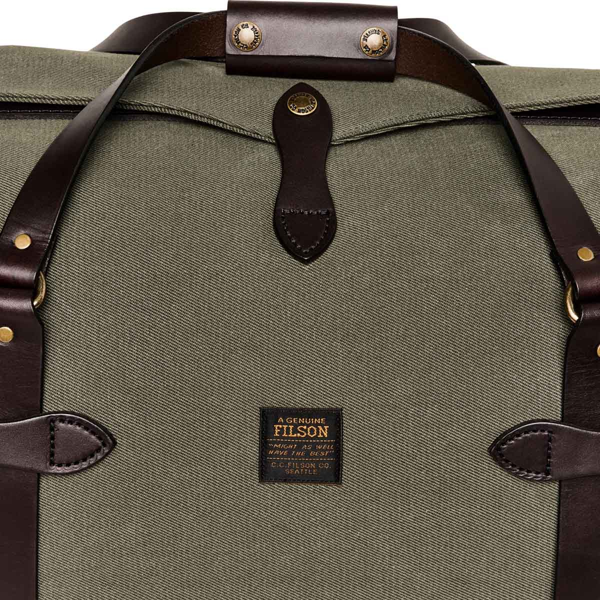 | Features | >Water- and abrasion-resistant Rugged Twill >Solid brass zipper closure custom cut at Filson with storm flap for added security >Adjustable, removable leather carrying strap with shoulder pad >Bridle Leather handles with two-snap grip >Sized at maximum airline carry-on size requirements, so you don't have to check your bag >Includes iconic Filson Bridle Leather body tabs >Bridle Leather handles wrap around bag to support heavy loads |