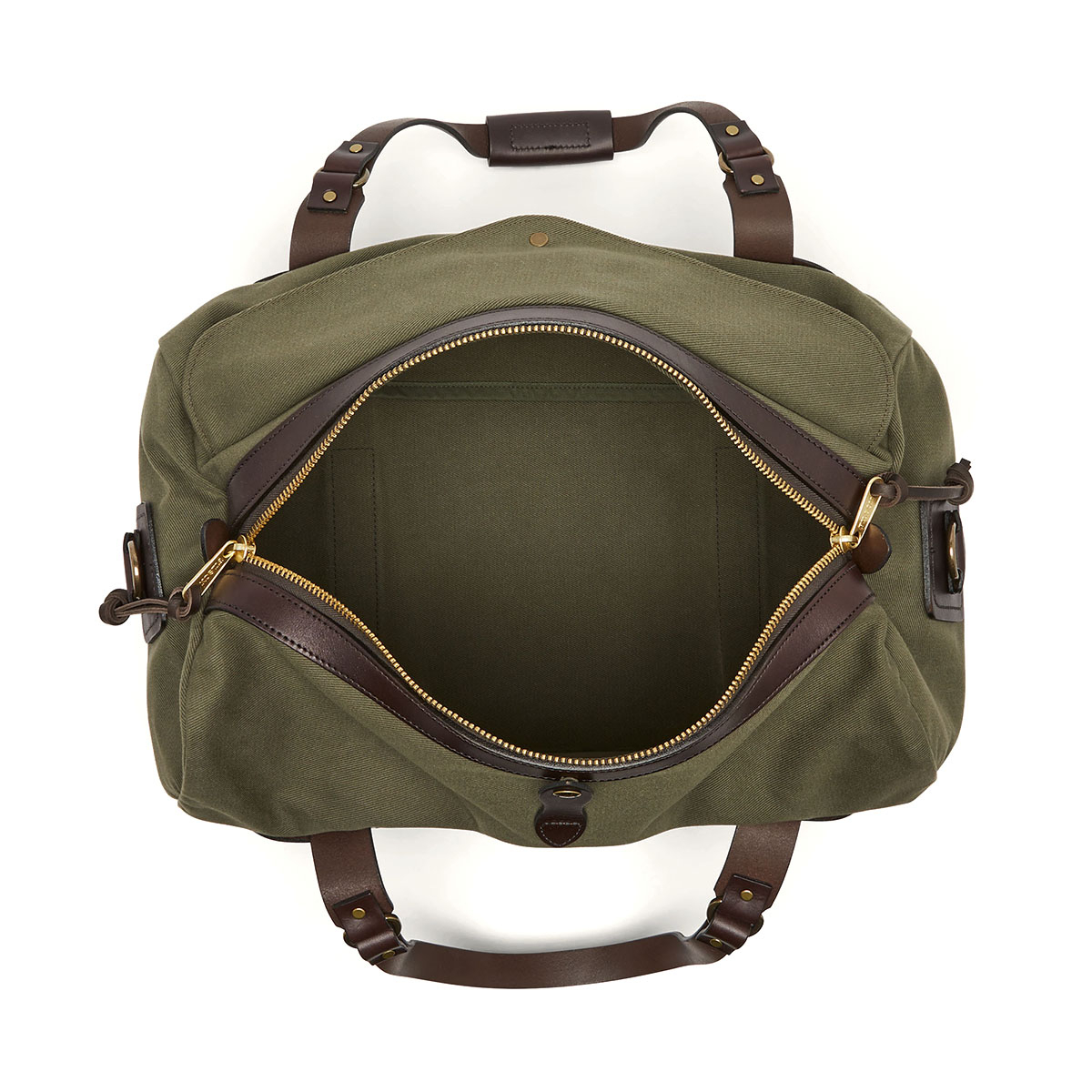 The lightly waxed Rugged Twill fabric keeps the contents dry. This Rugged Duffle has one large main compartment with one insert compartment each on the ends for organization. The bag closes with a solid brass YKK® zipper that is rustproof, virtually indestructible, and reinforced with Bridle Leather and protected by a press-stud fastening storm flap. Filson uses Bridle Leather for the removable shoulder strap, for the handles and the straps that wrap around the bag to safely carry heavy loads. An adjustable Bridle Leather shoulder strap features a sliding shoulder pad for comfort with heavier loads, allows shoulder or cross-body carry, and can be removed when you want to carry it by hand.