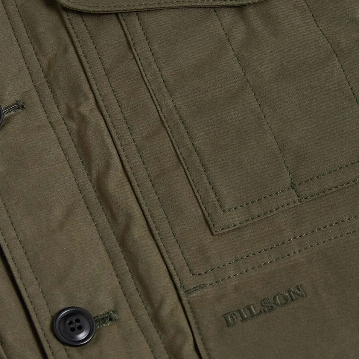 | Features | >Made-in-UK water-resistant waxed fabric >Flannel lining and warm cotton lined pockets >Filson embroidery on left pocket >4-hole button front closure >Pockets with Filson logo snap buttons |