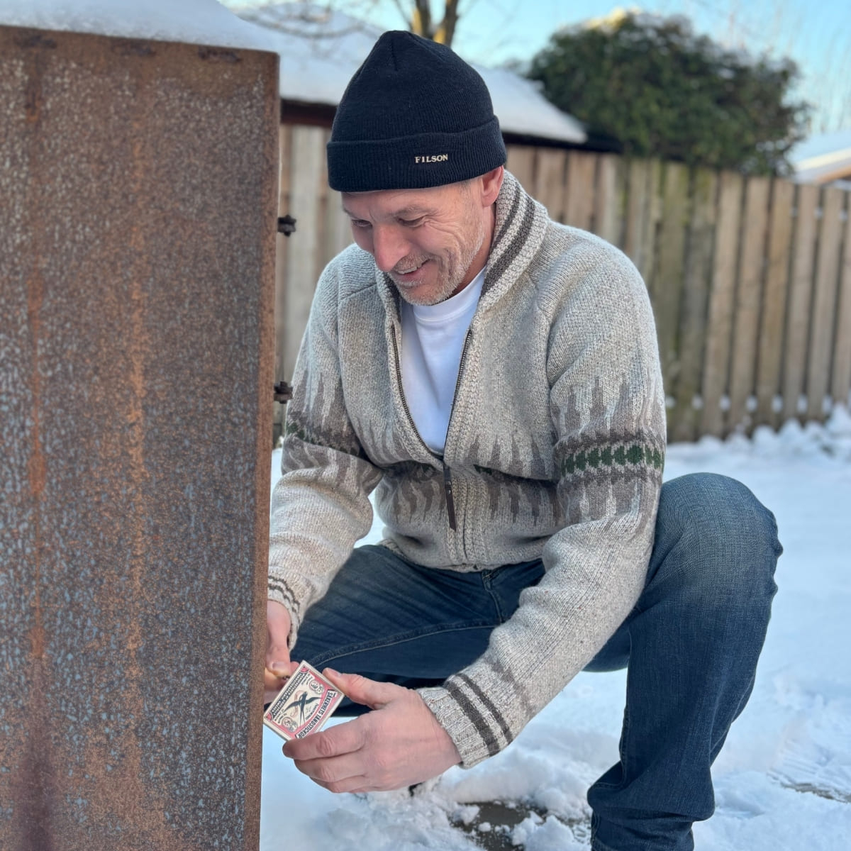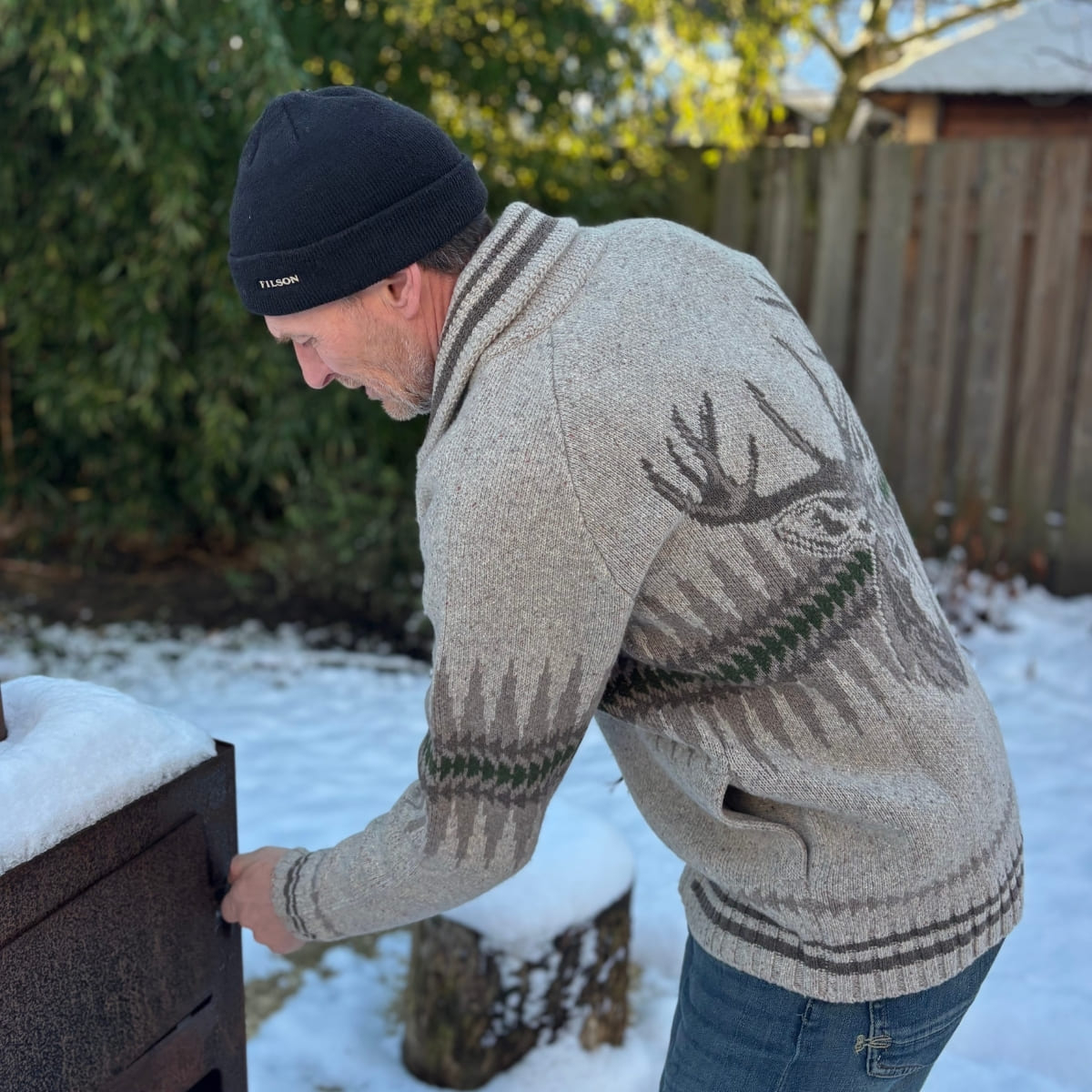 The Western-style cardigan can be worn casually over a basic T-shirt or a shirt, such as a Filson flannel shirt. Pair it with dark jeans and a pair of Red Wing shoes for an effortless, stylish look.